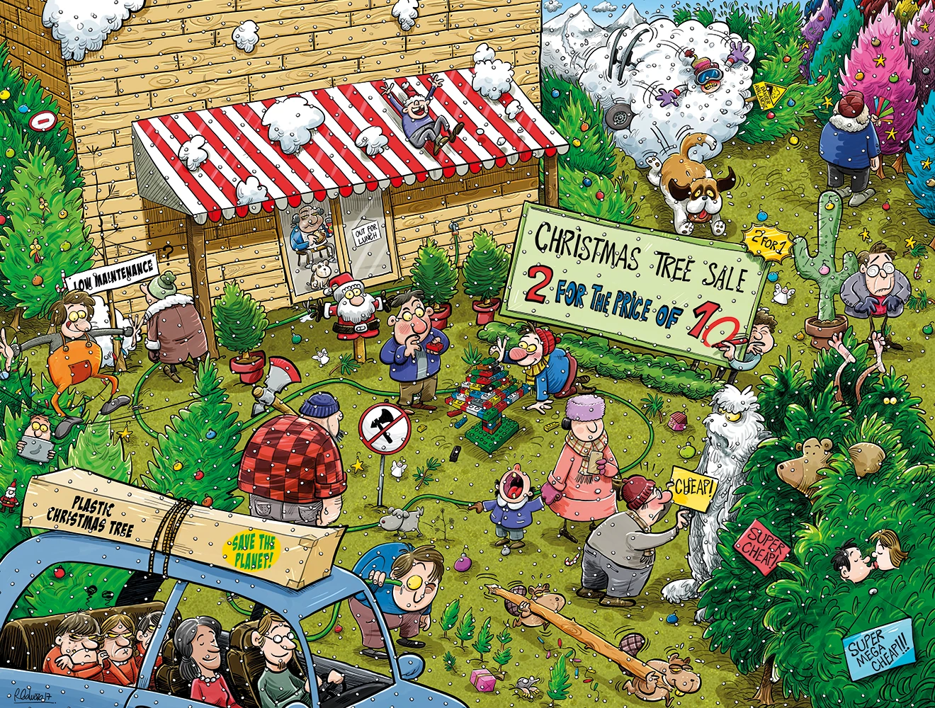 A skier in a giant snowball is careering towards the centre of the yard, while a terrified St Bernard tries to flee the scene. One couple are very pleased with their eco-friendly plastic tree, much to the kids’ disappointment.