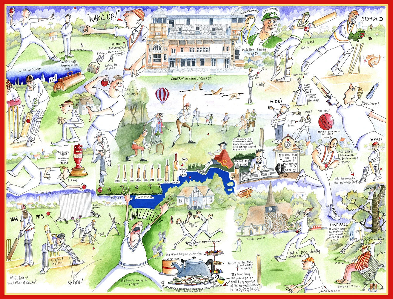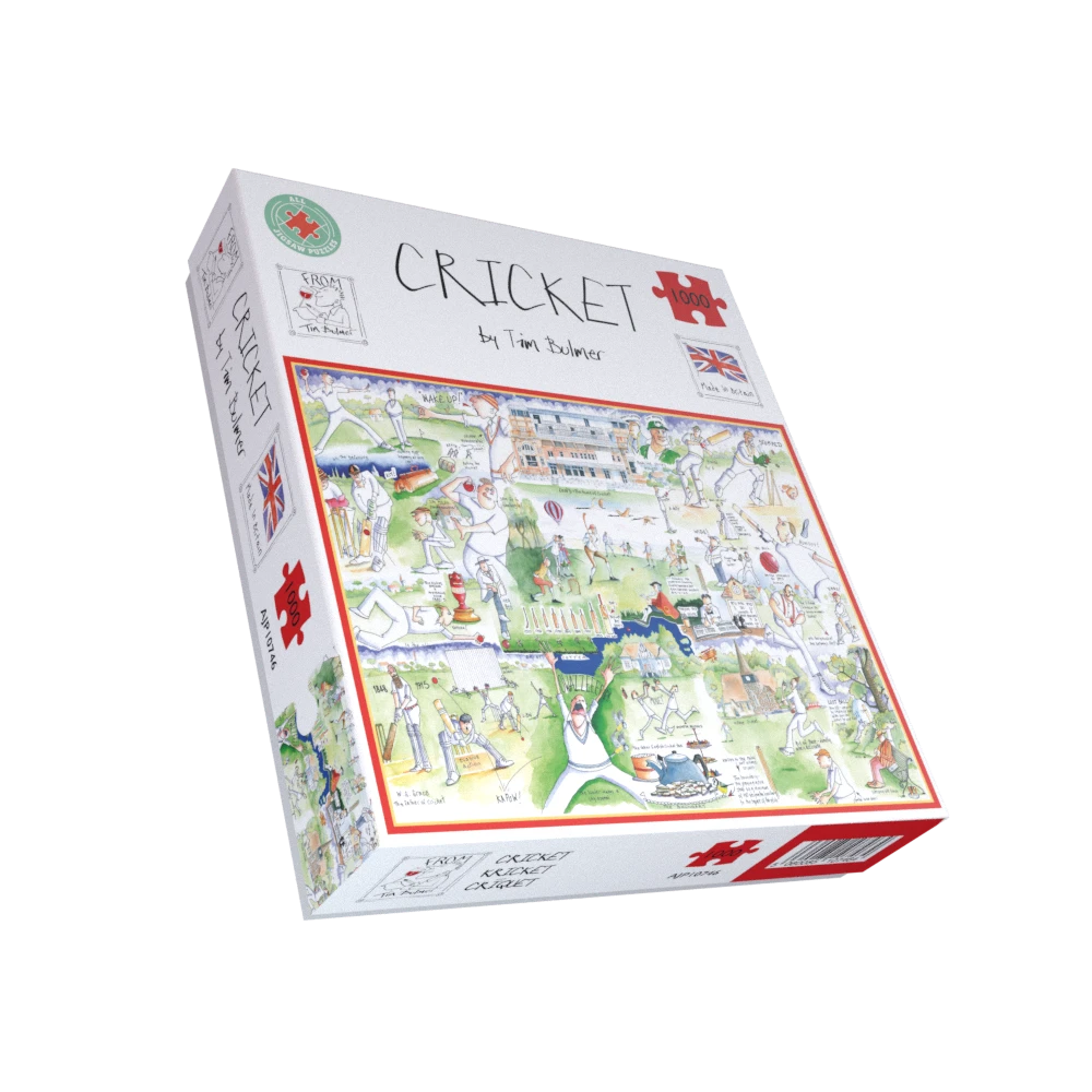 You’ll be bowled over by this fun Cricket jigsaw puzzle by Tim Bulmer! This fascinating puzzle features this traditional and popular sport, highlighting idiosyncrasies associated with the game and fun illustrations.