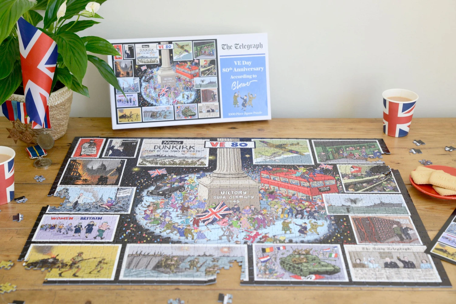 Depicting scenes of troops, tanks, fighter jets and warships in battle, alongside iconic headlines, leaders and the women who kept calm and carried on, this puzzle captures the spirit of VE Day.