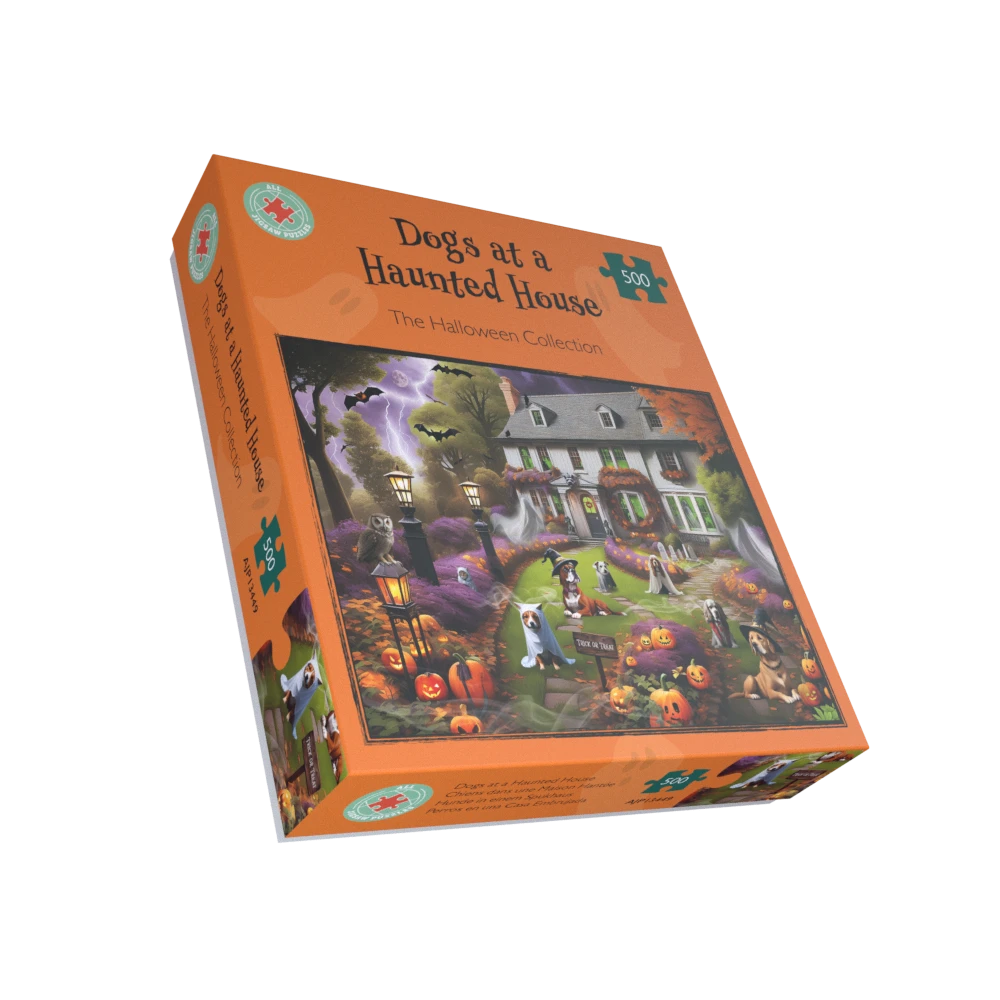 Enjoy Freakishly good fun with dogs at a Haunted house available as 1000 or 500 piece jigsaw puzzle.