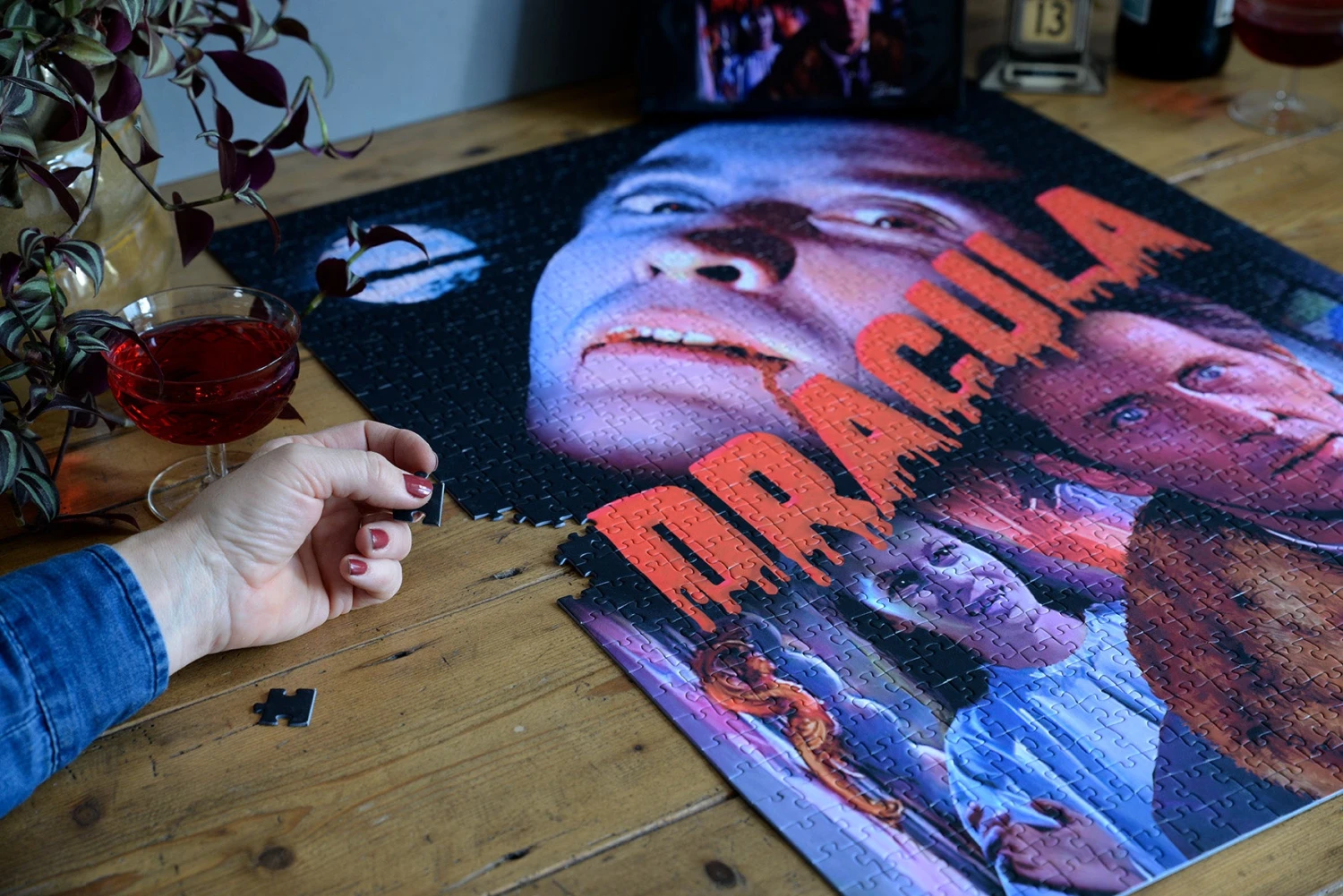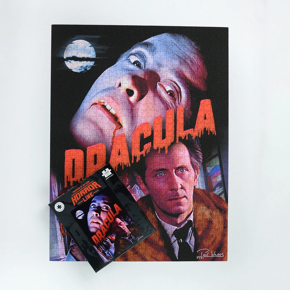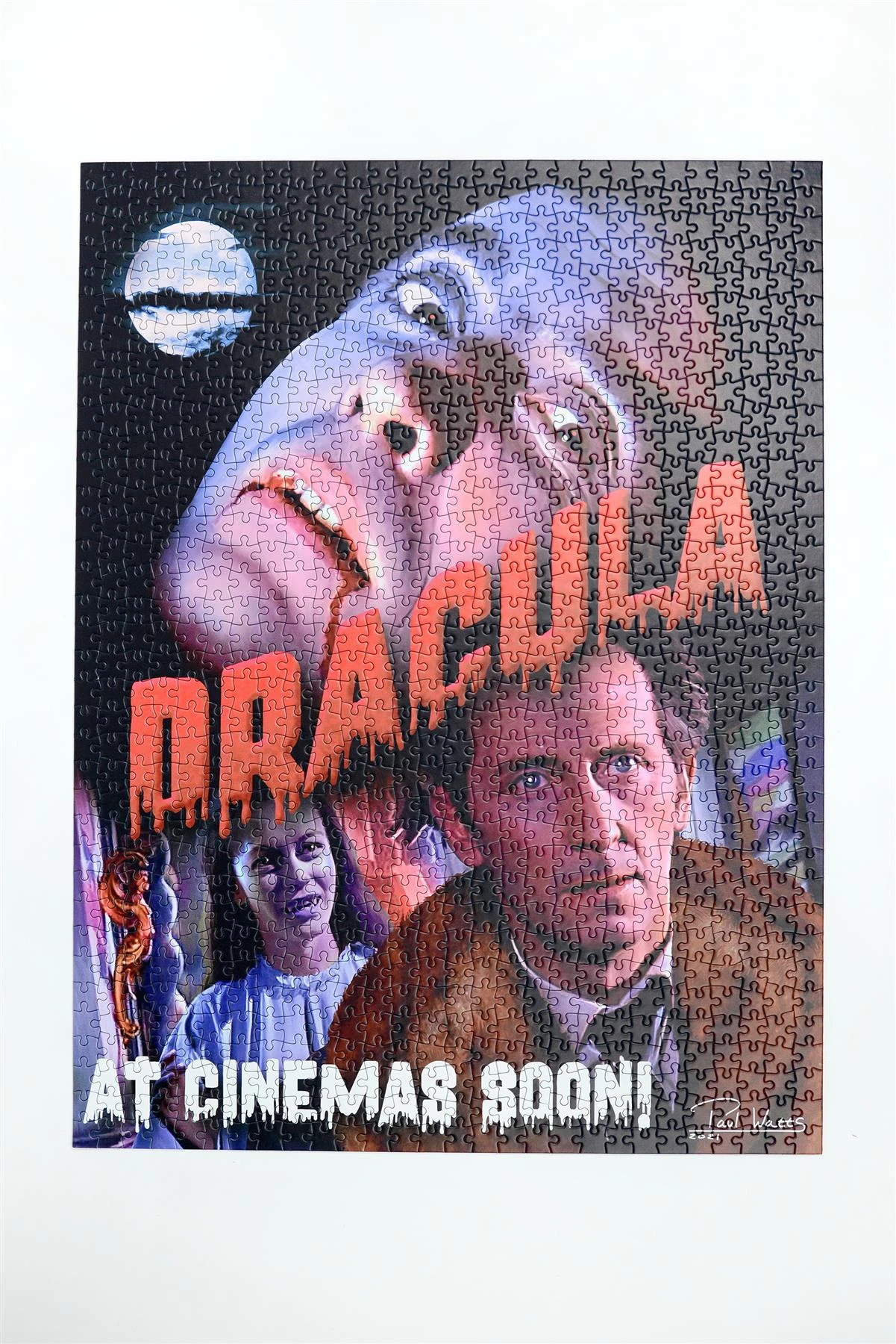 This eerie jigsaw puzzle features Paul Watts’ chilling artwork, capturing the essence of Christopher Lee as Dracula, the Crown Prince of Darkness, and his eternal adversary, Van Helsing. Inspired by the iconic Hammer era of Dracula movies, this haunting image was first revealed in the renowned US magazine Little Shoppe of Horrors. Perfect for those who embrace the shadows and the macabre.