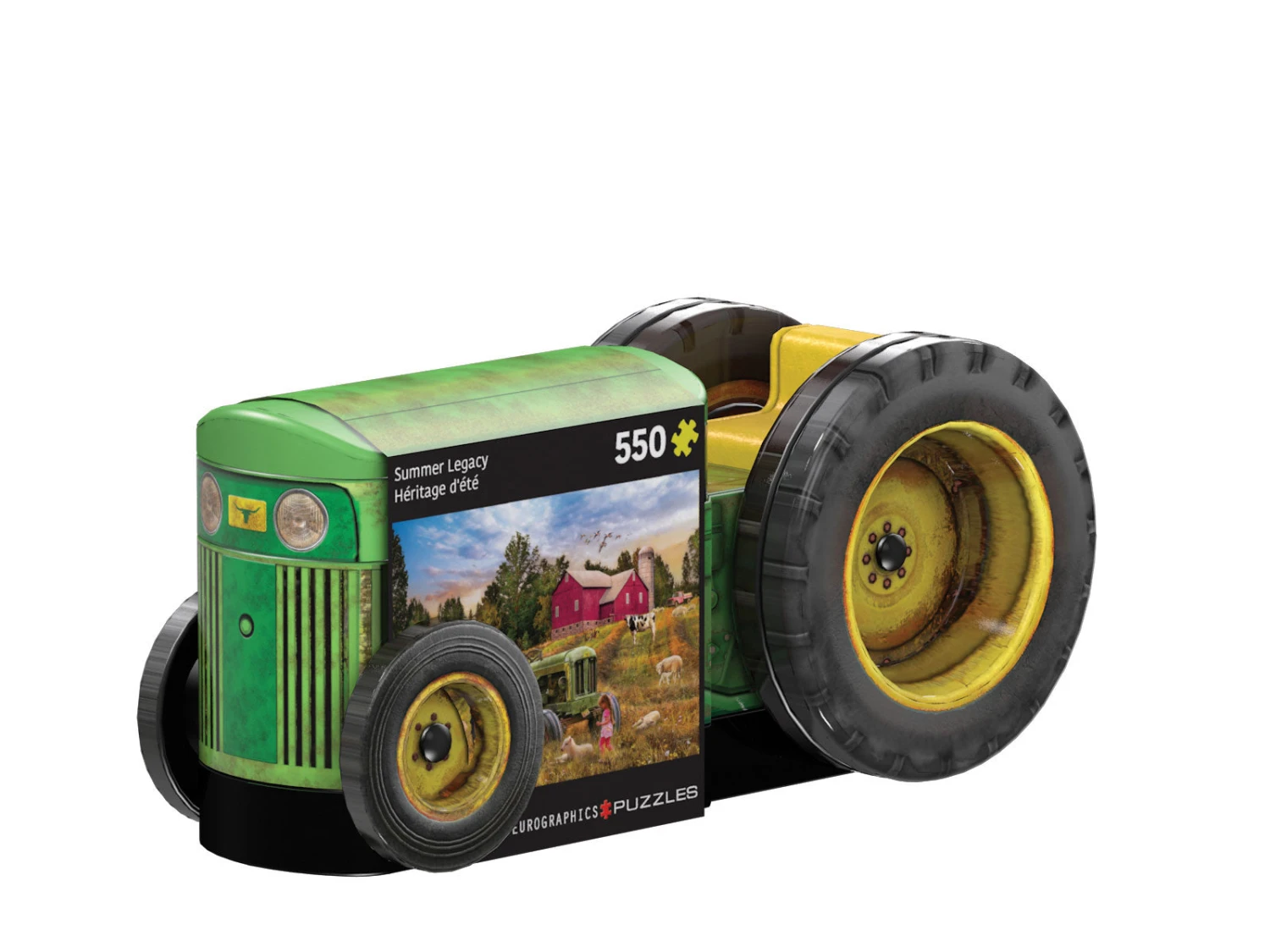 A vintage green shaped tractor tin with puzzle and poster. Across rural farmlands, a well recognized image. Puzzle is a nostalgic landscape farm scene.