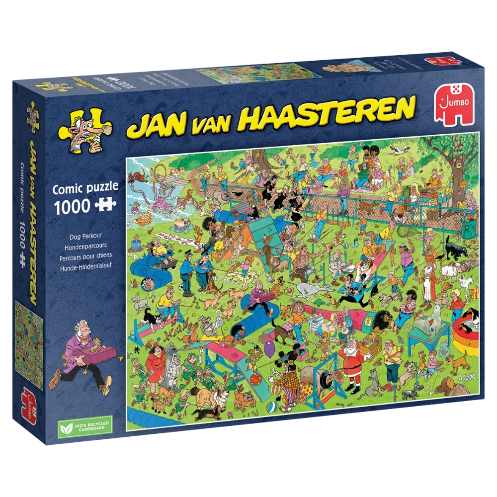 Dive right into this chaotic scene, full of energetic dogs and comical characters as they compete in Jan Van Haasteren’s Dog Parkour 1000 Piece Jigsaw Puzzle!