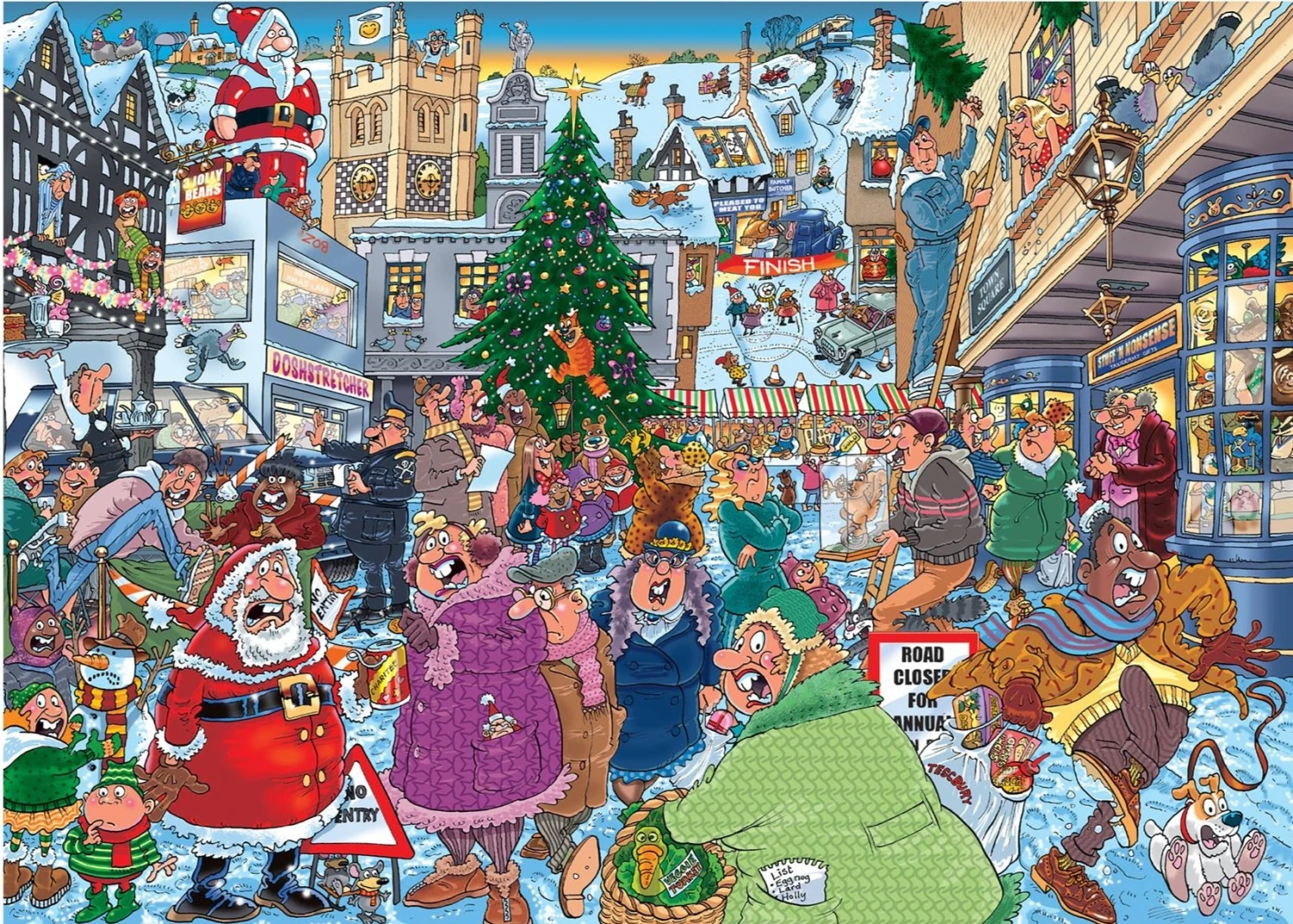 With the road closed and the friendly local townsfolk ready for the Santa Dash, nothing could be more quintessentially Christmas than assembling this teeming tapestry of holiday cheer. Marvel at the quaint Christmas market teeming with market stalls, an eclectic mix of characters, and the hustle and bustle of Christmas fun. Enjoy the tactile bliss of piecing together the intricate details of this chaotic cartoon jigsaw.