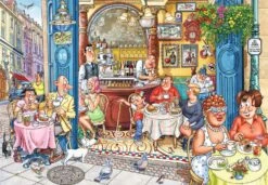 Grabbing a Quick Bite‚ is the title of this fantastic Wasgij Mystery 1,000-piece jigsaw puzzle. Take a stop off for a bit of lunch at cafe Val’s le clairs. It’s a beautiful afternoon and everyone is enjoying a spot of lunch. But what could spoil people’s appetites? Use your imagination, and the clues provided on the box, to piece together what will happen next? This is the scene you will have to puzzle.