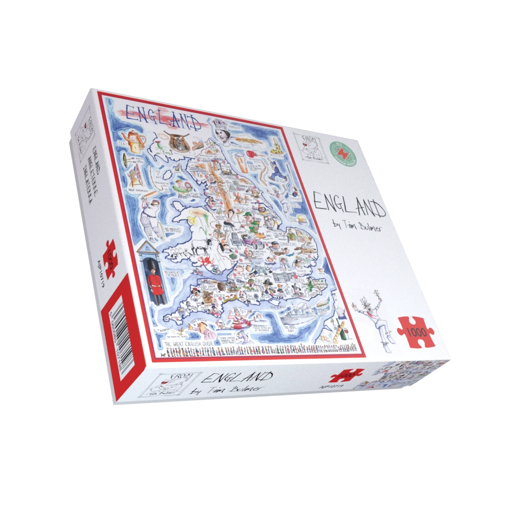 The map clearly shows cities from around the country, but also includes sketches the suit that area, such as a pirate in Cornwall and Robin Hood in Nottingham! Around the map, you will find typical English quirks, such as a Morris dancer, fish and chips, a pot of tea and of course, the great English queue!