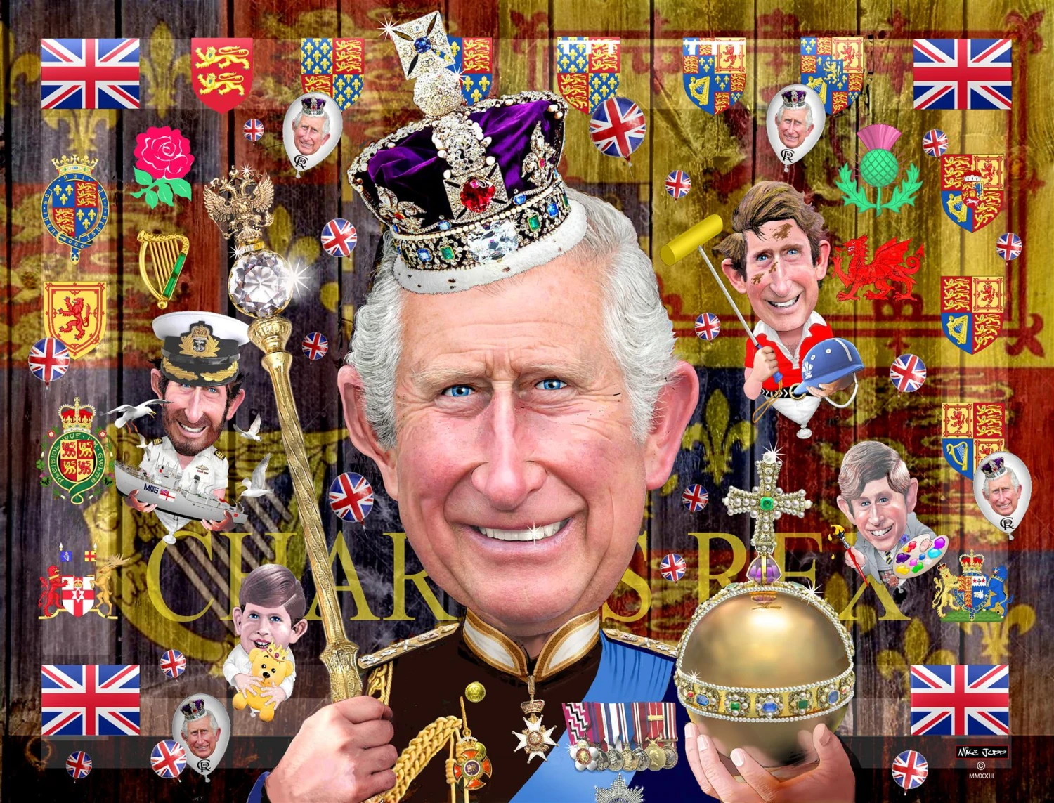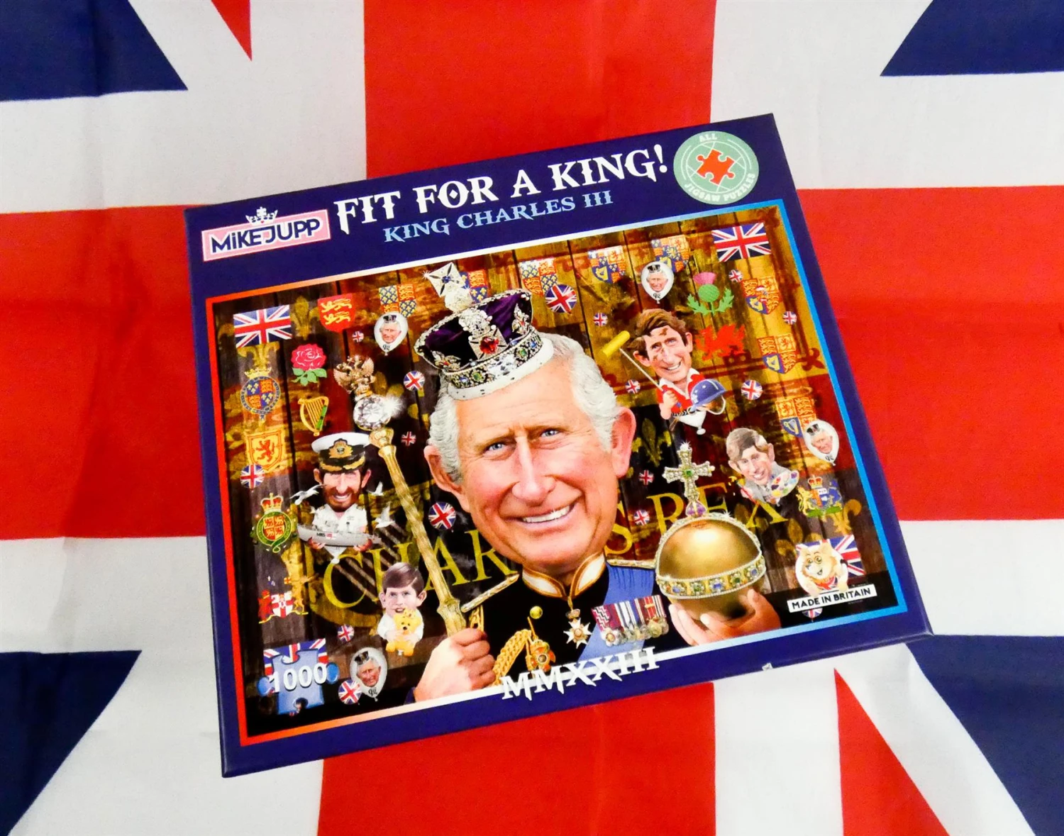 A fantastically fun, light-hearted 1000 piece jigsaw puzzle for all ages to enjoy! Mike’s cleverly captured Charles’ cheek, charm and unique sense of humour in this cracking cartoon-style coronation puzzle.