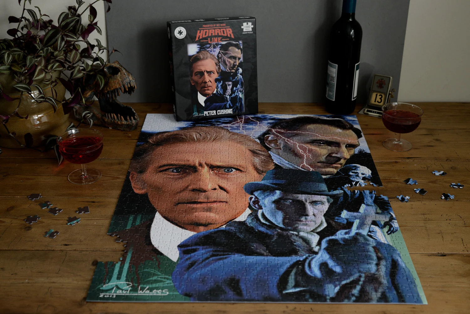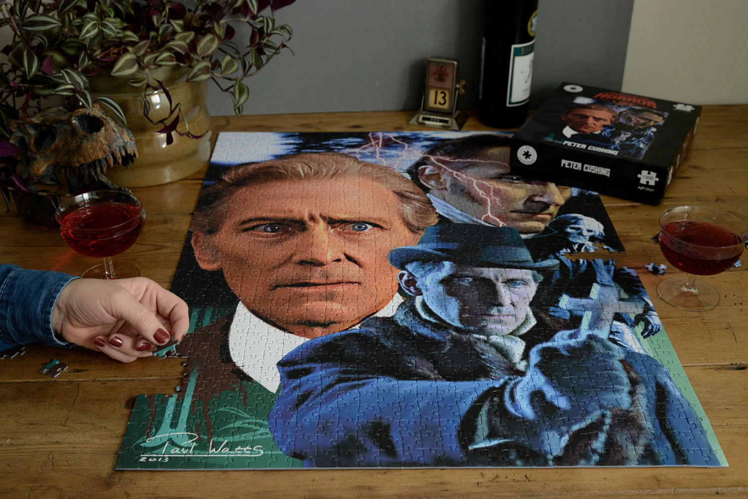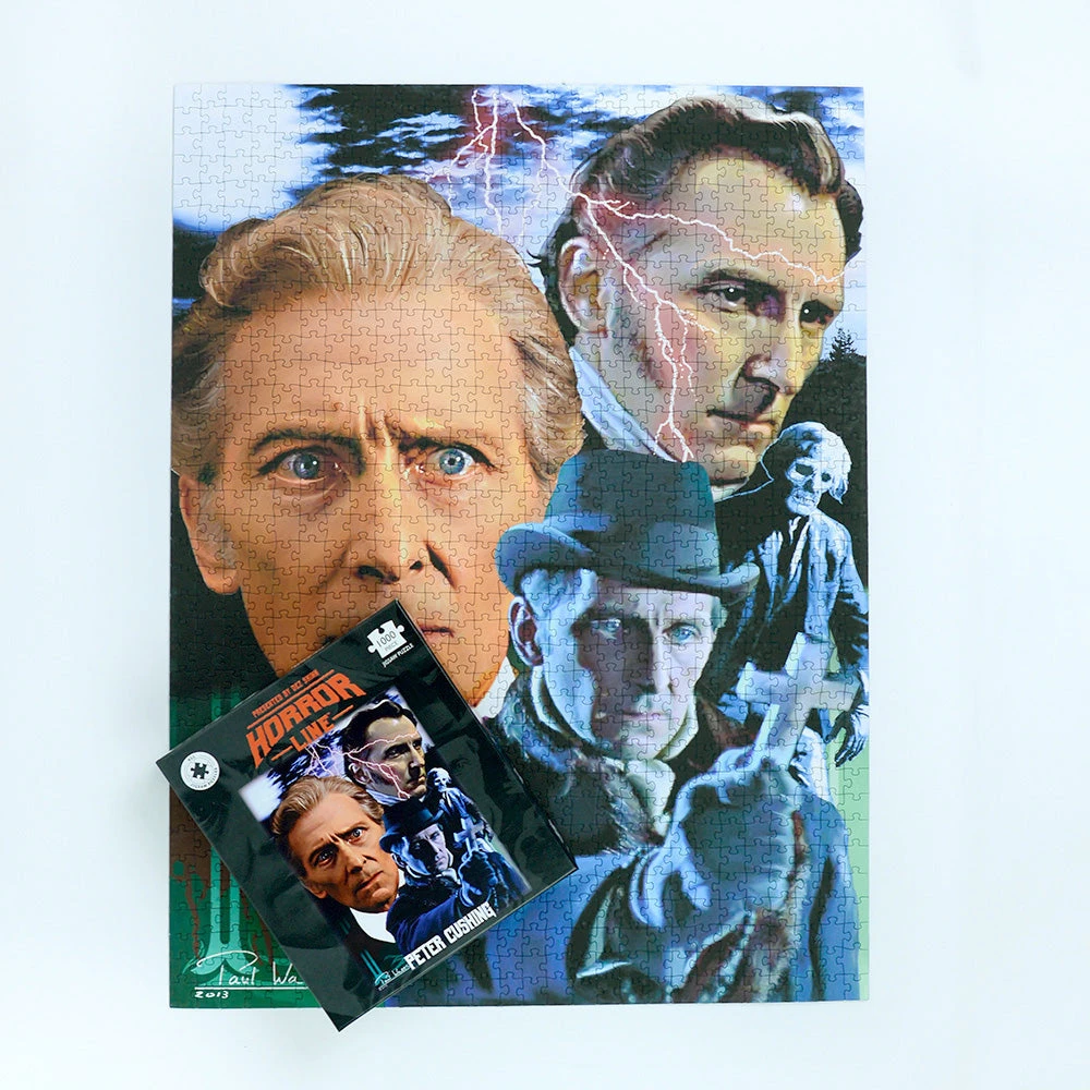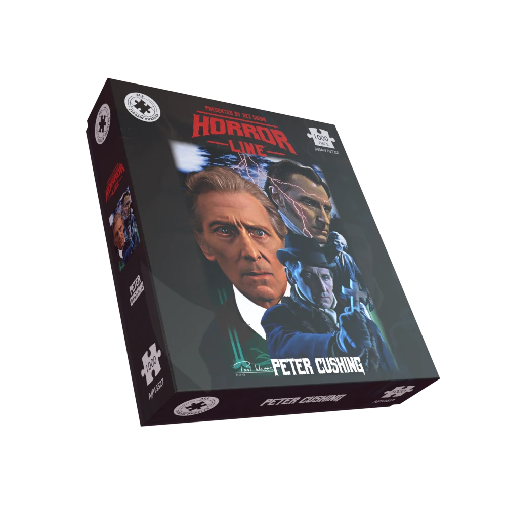 From Baron Frankenstein to Professor Van Helsing, this haunting jigsaw puzzle features Paul Watts’ eerie artwork, bringing Peter Cushing, ‘The King of Horror,’ to life in all his terrifying glory. First unveiled in the renowned horror film magazine We Belong Dead, launched by Eric McNaughton in 1990, this puzzle is perfect for those who revel in the macabre.