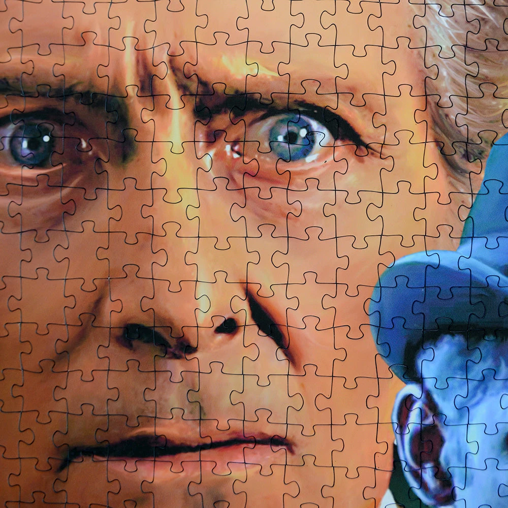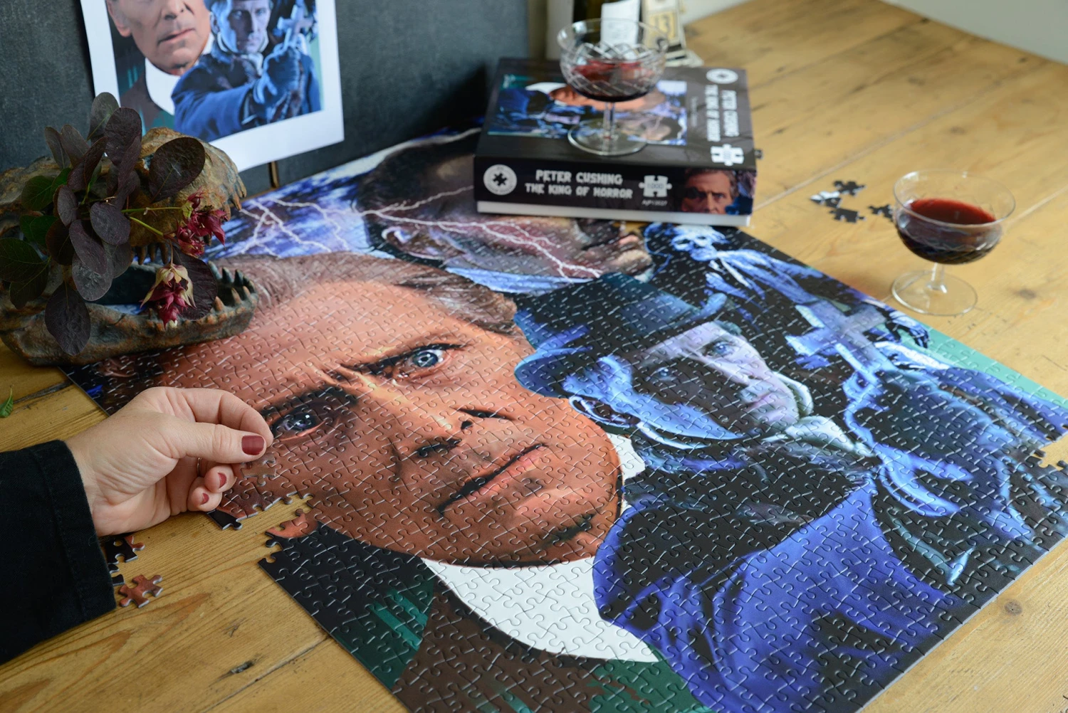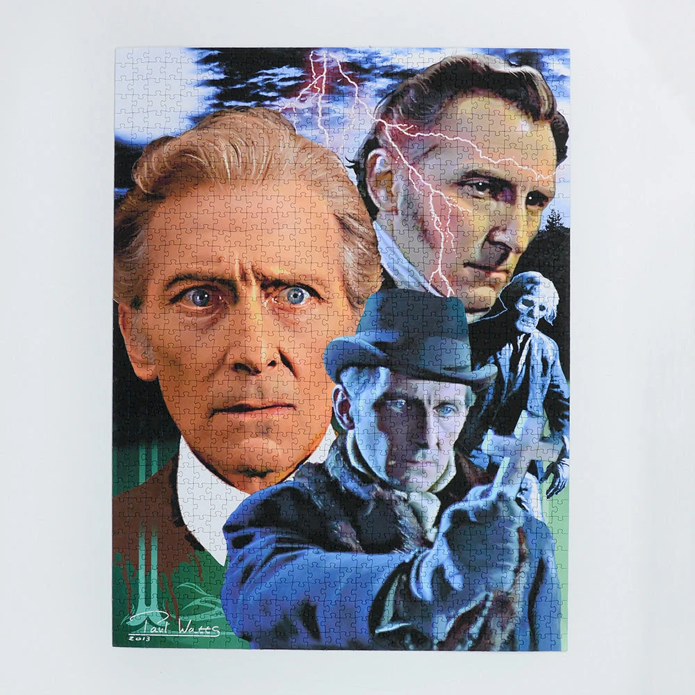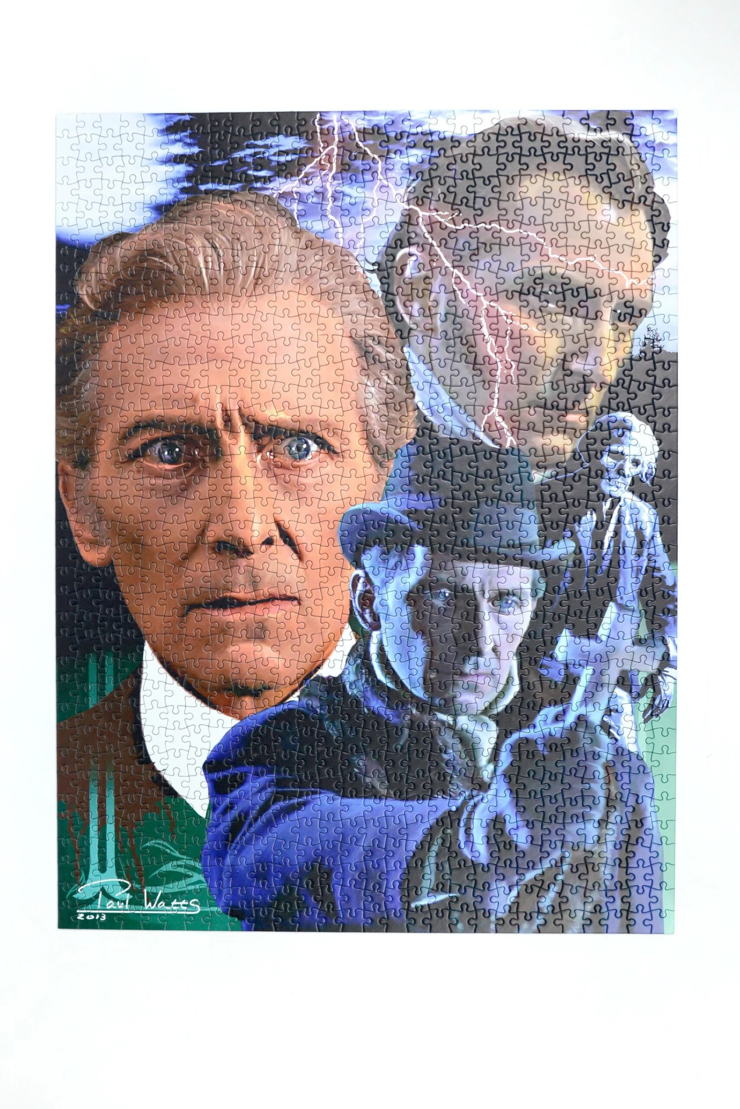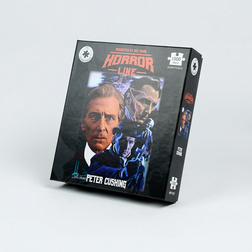 From Baron Frankenstein to Professor Van Helsing, this haunting jigsaw puzzle features Paul Watts’ eerie artwork, bringing Peter Cushing, ‘The King of Horror,’ to life in all his terrifying glory. First unveiled in the renowned horror film magazine We Belong Dead, launched by Eric McNaughton in 1990, this puzzle is perfect for those who revel in the macabre.