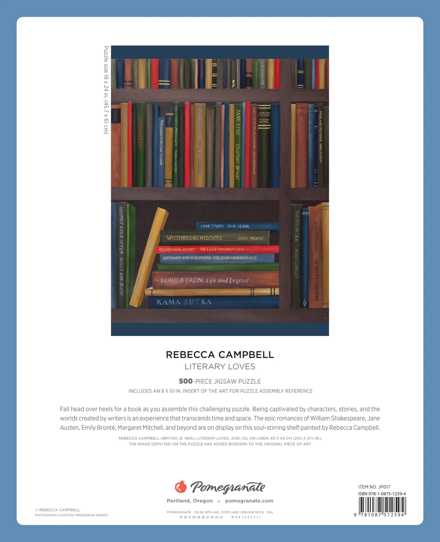 Experience the timeless magic of beloved characters, unforgettable stories, and iconic worlds created by legendary authors. From the romantic tales of William Shakespeare, Jane Austen, and Emily Brontë to the sweeping dramas of Margaret Mitchell and more, this visually stunning bookshelf puzzle, illustrated by Rebecca Campbell, celebrates the enduring power of epic romances and classic storytelling.