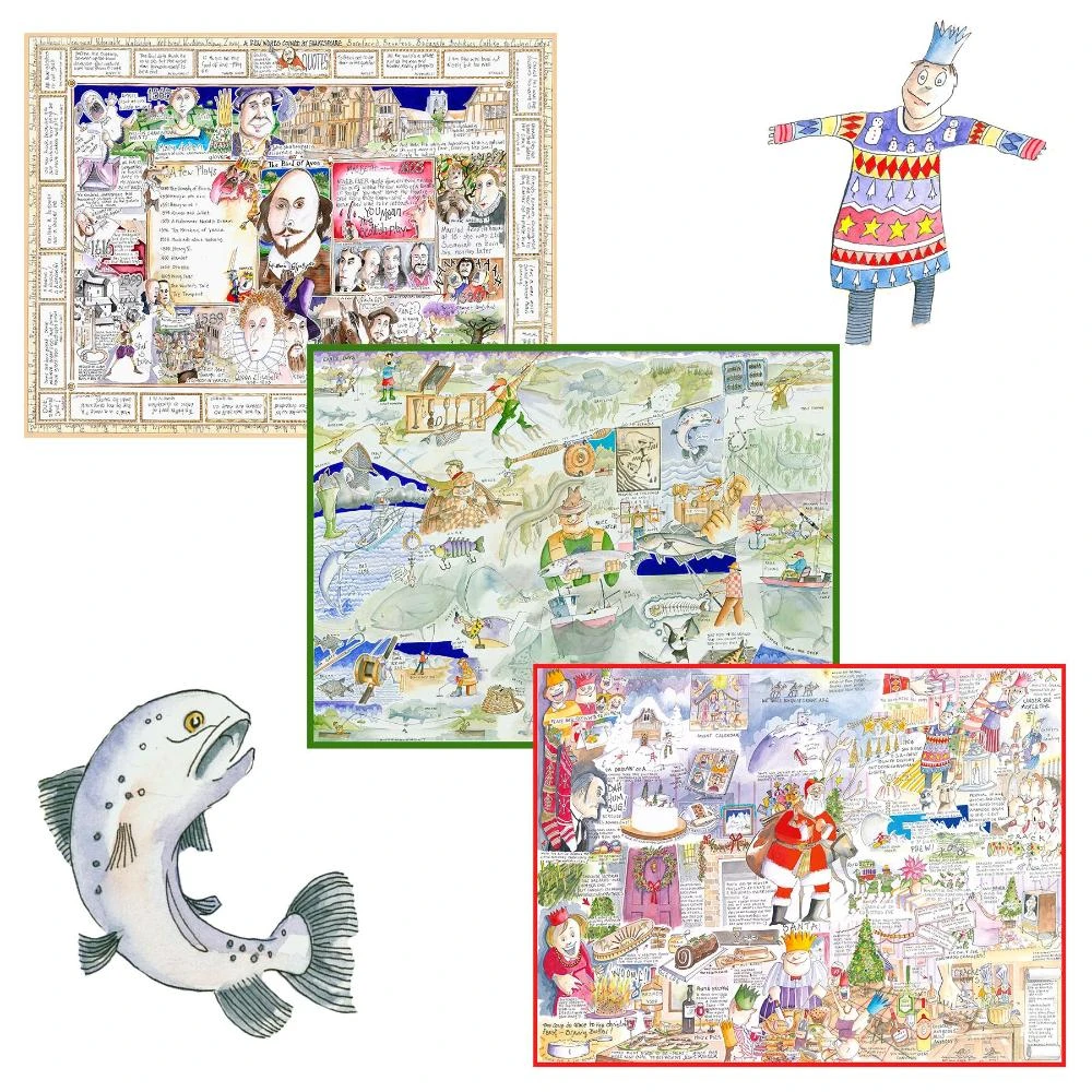 Ultra-talented artist Tim Bulmer creates whimsical artwork full of fun facts about everything from Scotland to skiing. With this set of 3 x 1000 piece jigsaw puzzles, You’ll find out fun facts about the world’s most famous playwright, one of the country’s favourite sports and everyone’s most beloved time of the year.