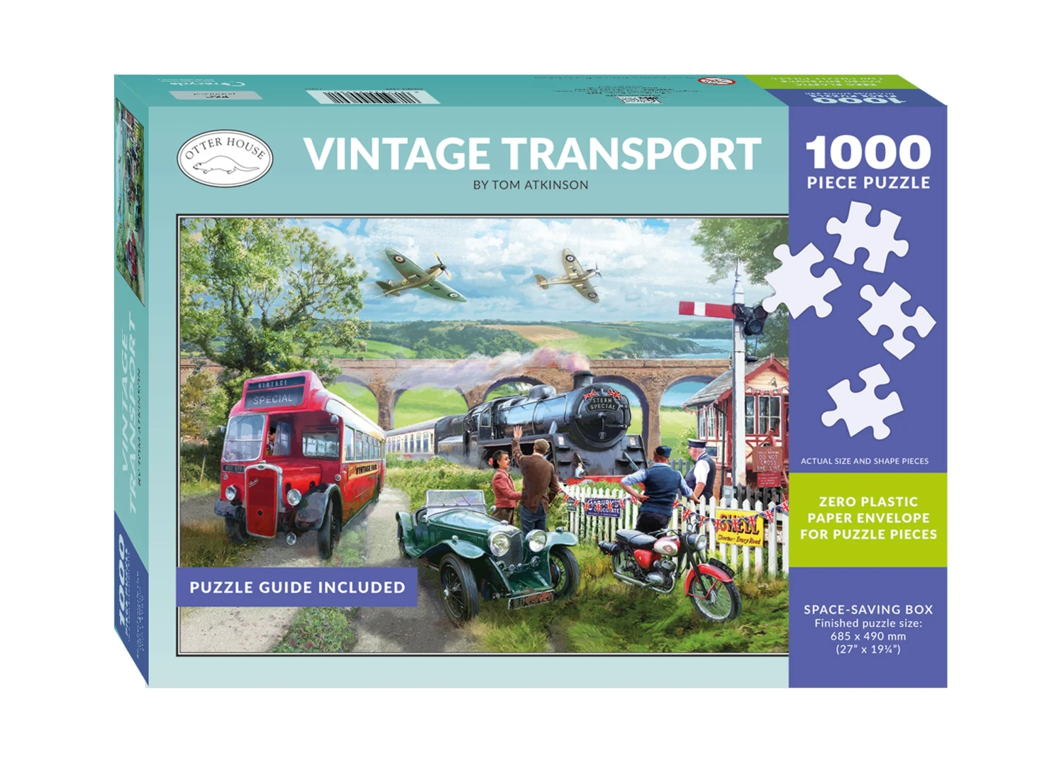 Illustrated by Tom Atkinson, this beautifully detailed artwork captures the golden age of travel, showcasing a vintage steam train, an old-fashioned red bus, a classic car, a motorbike, and even World War II fighter planes soaring overhead.